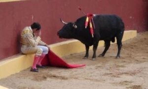 Это невероятное фото знаменует собой конец карьеры матадора Альваро Мунеро. Он упал в раскаянии в середине боя, когда он понял, что зверь не хочет с ним бороться. В будущем этот матадор стал заядлым противником боя быков. (На фотографии морда быка как бы говорит - меня тяжело ранили пикадоры, но я не хочу с тобой драться, не хочу, даже когда твои товарищи меня так сильно ранили, хотя я не сделал им ничего плохого). Мунеро так рассказывает о том бое - "И вдруг, я посмотрел на быка. Он стоял передо мной и смотрел на меня. Просто стоял и смотрел, не делая попыток напасть на меня. Он - это сама невинность, такая, какую все животные имеют в своих глазах, и он посмотрел на меня с мольбой о помощи. Это было похоже на крик о справедливости и где-то глубоко, внутри меня я понял, что он обращается ко мне как мы обращаемся в молитве к Богу - я не хочу с тобой бороться, пожалуйста, пощади меня, ведь я не сделал тебе ничего плохого. Убей меня если хочешь, на то будет твоя воля, но я не хочу с тобой драться. И я, прочитав это в его глазах, почувствовал себя худшим дерьмом на земле и прервал бой. После этого я стал вегетарианцем и стал бороться против корриды".